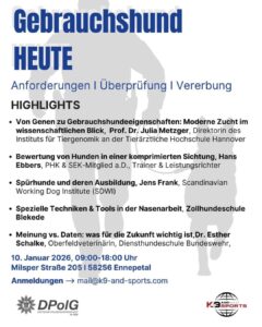Mit 120 angemeldeten Teilnehmerinnen und Teilnehmern ist die Veranstaltung ausgebucht, für alle anderen wird eine Online-Übertragung vorbereitet. Gemeinsam gestalten wir den Gebrauchshund von morgen.